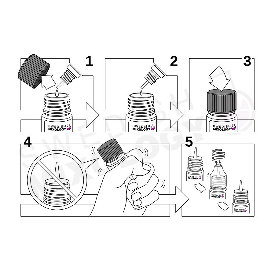 Innehåll shortfill innan utspädning: 40 ml e-juice med +50% smak (för att kompensera att 2 shots ska tillsättas) eller 50 ml e-juice med +25% smak (för att kompensera att 1 shot ska tillsättas).